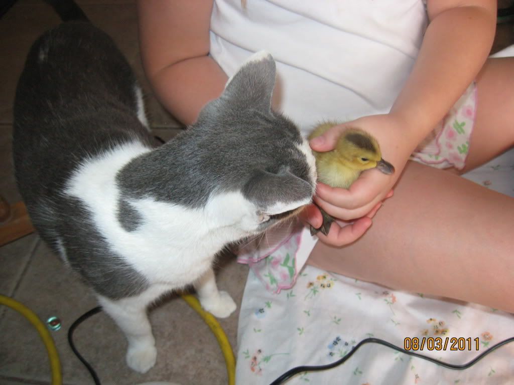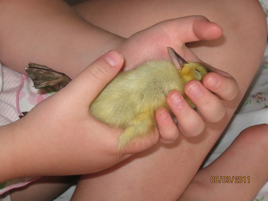 We got them home and introduced them to the dogs and New Cat. The geese came up to the back door to beg for food and attention while we were busy with the new babies. After about an hour and a half I called it quits, put on some cartoons in my bedroom for C and tried to get a few more hours of sleep (I was running on about 3 hours up to that point).