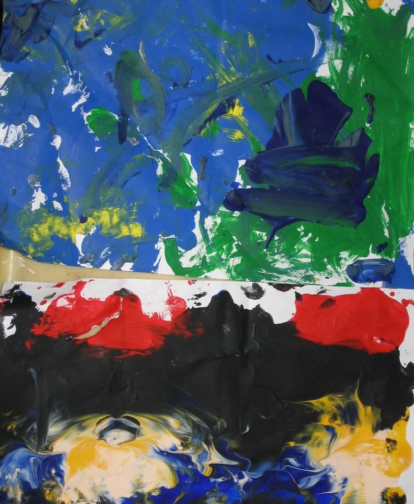 They tried to dry their paintings by laying them (paint down) on the post near our front door. They said they didn't realize the paint would transfer from the paper to the post. Ah well. That post needed to be painted soon anyway.