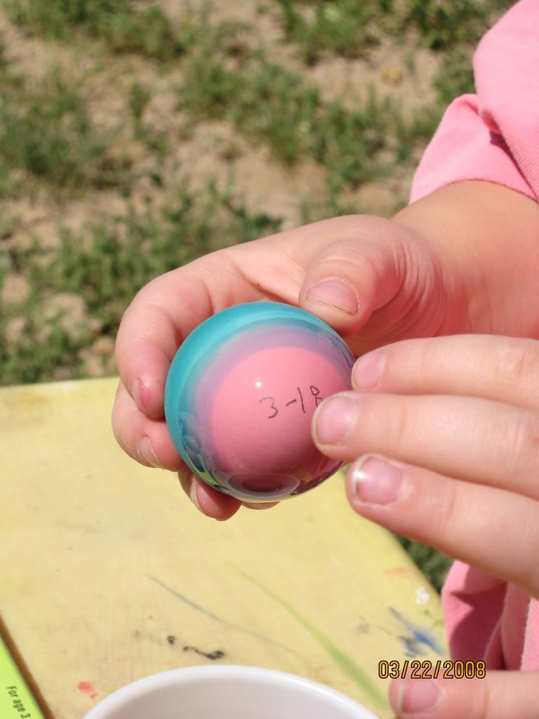 Apr. 2nd, 2008 03:23 pmWe dyed eggs the day before Easter. I boiled up ten of our brown eggs (I used all the babies' eggs we had on hand) and the one white egg we had left over from the last time I had to buy store eggs. It turns out that brown eggs dye fairly well.