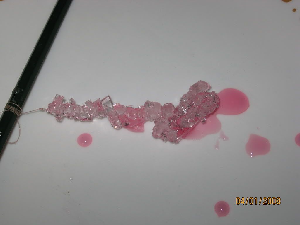 This is our most successful attempt at making rock candy to date. We added red food coloring to the sugar water mixture to try to make pink rock candy. Once the liquid was washed away, the candy just looked clear, so the dye didn't take.