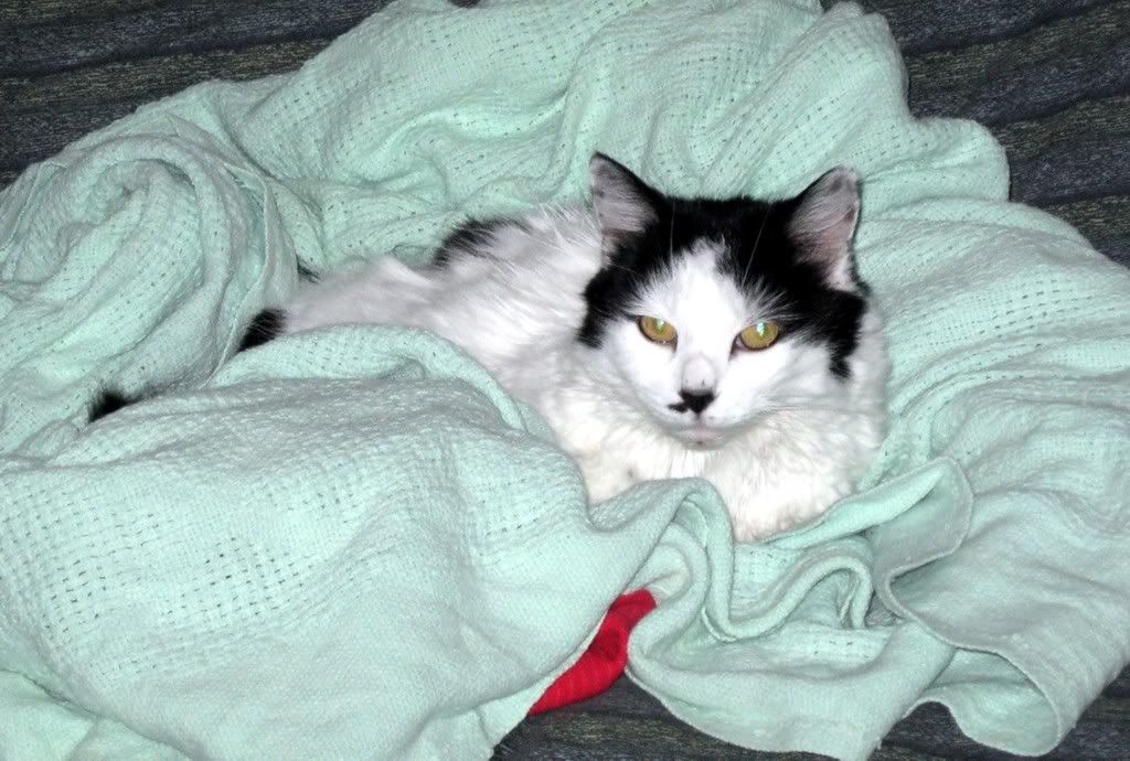 New Cat came to us about a month and a half ago. Splatcat died a few hours ago. She had been ill for the past few weeks. We hoped she would pull through, but tonight she came out of our closet and we could tell she wasn't going to last the night.