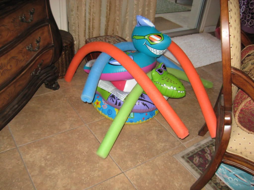 While H is often drawing, S spends more time creating in 3D. While we were at a swim/filk a few months back S made a sculpture out of the pool toys.