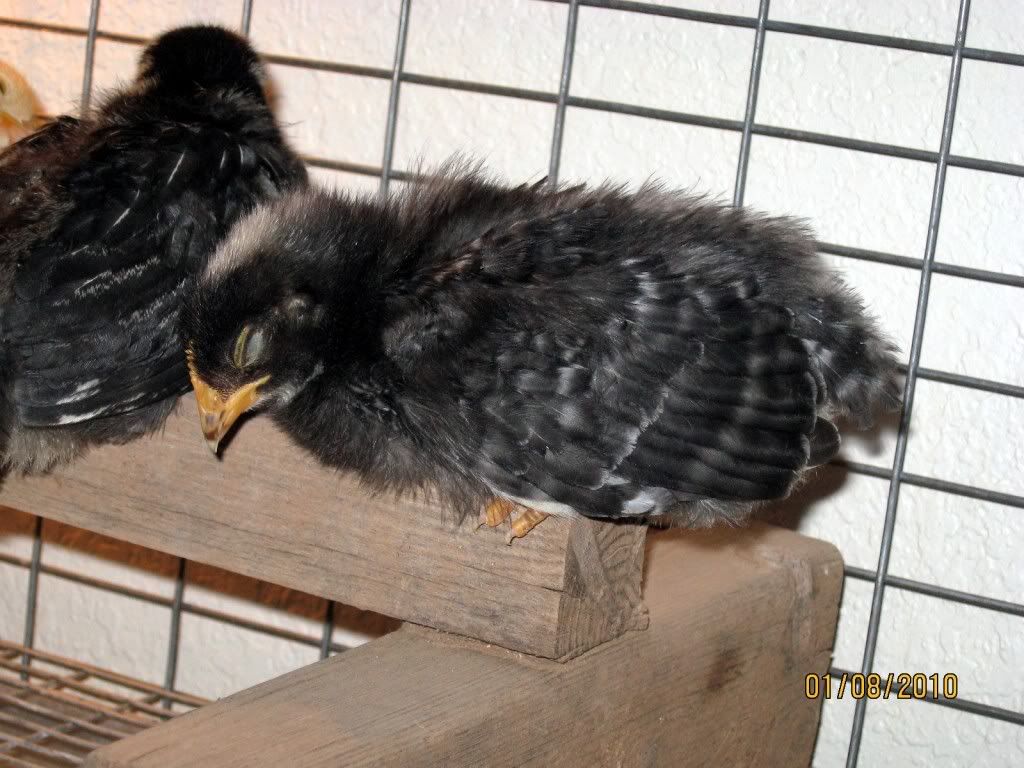 They are about ten days old. A little old for puffballs, but still small enough to be cute. I didn't feel like driving all over looking for younger chicks - the kids were happy with the babies' size, and I was pleased we'd found a Barred Rock. We've always had good luck with our Barred Rocks in the past - they were calm and solid layers.