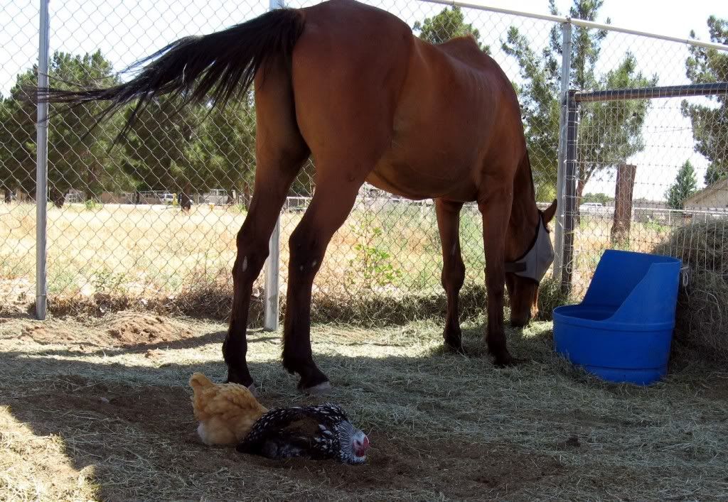 In this particular case they are C's Goldie Feather (the yellow Buff Orpington) and H's Looloo (the black and white Laced Wyandotte), but I have seen all of the younger chickens at this, and at least one of the older ones.