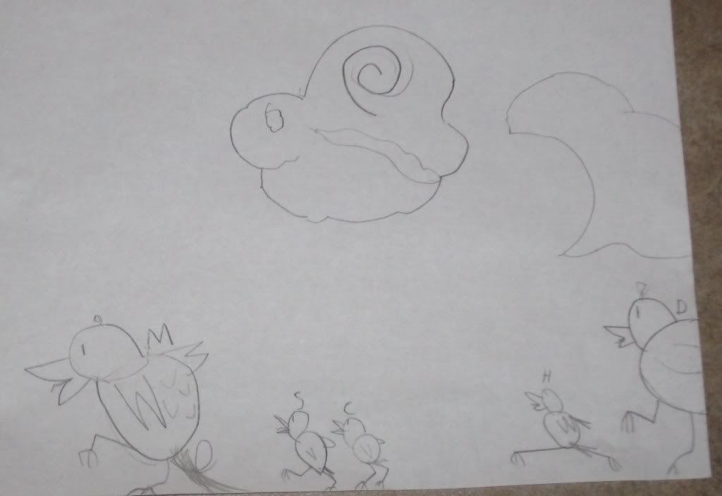 I think she is getting much better at this drawing thing. She's developing her own style. I love how much movement she puts into her pictures. She made the following picture for me yesterday. She's the bird with the H above it's head, she said she got distracted and is running to catch up with Daddy (note the D) close behind.