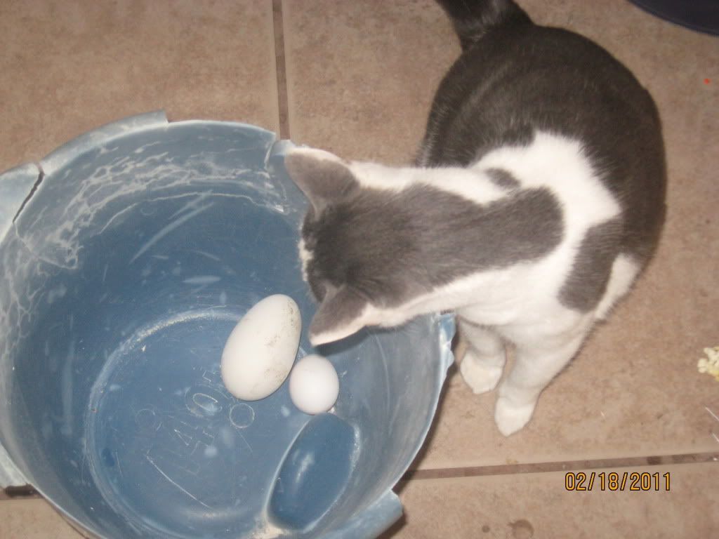 The above shot was taken after the first egg was found. I left it in the bucket next to a chicken egg (one of Snow's) for comparison. The cat came up while I was taking some shots and nearly knocked over the bucket trying to get at the eggs.
