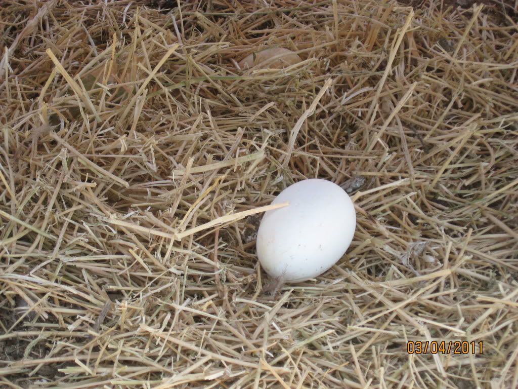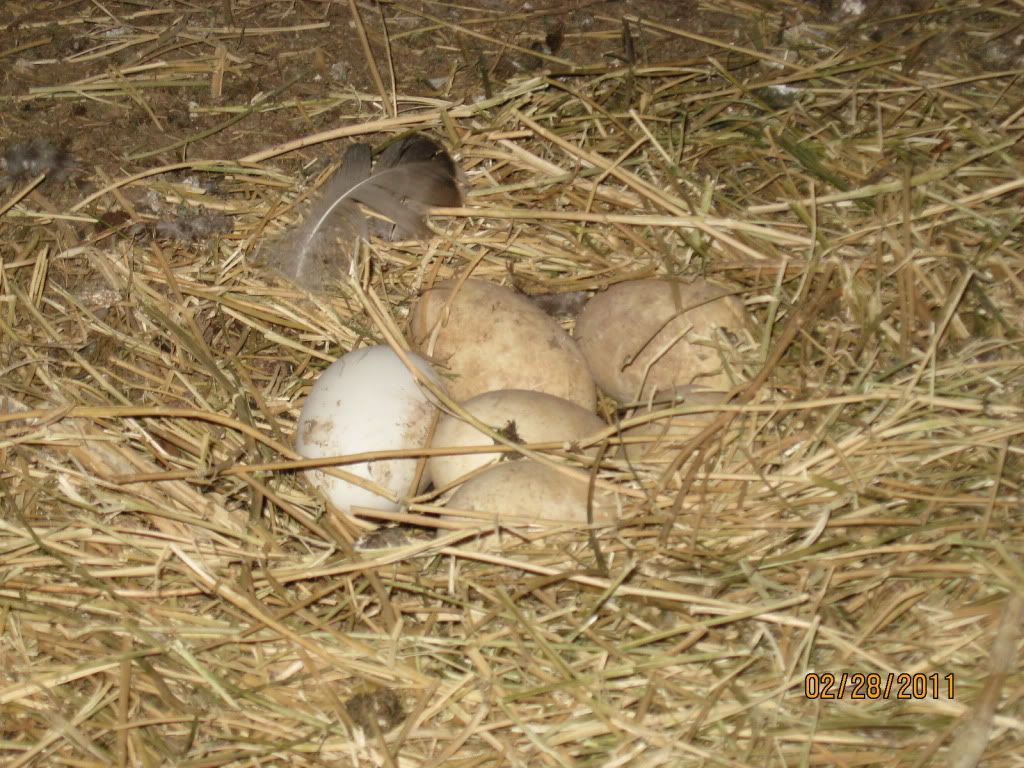 Eight goose eggs. Really, they're there. They're just covered by hay. The white one on top is the newest.