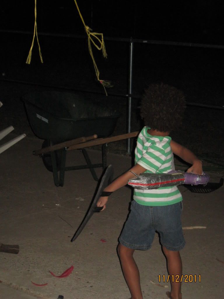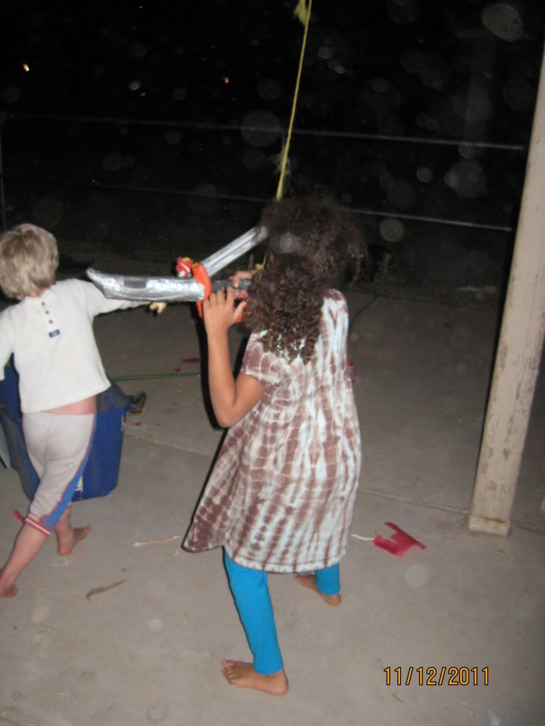 One of C's favorite memories of the evening was fighting in the backyard with my friend and his kids (C was particularly impressed with my friend's willingness to battle more than once). We haven't seen this batch of kids in nearly five years, so it was fun to see all the changes age can bring.