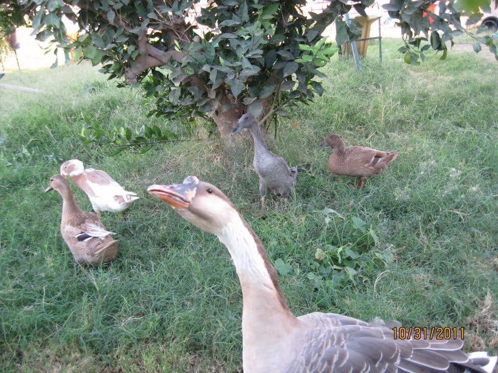 Speedy, the female goose, with the ducks in the background.