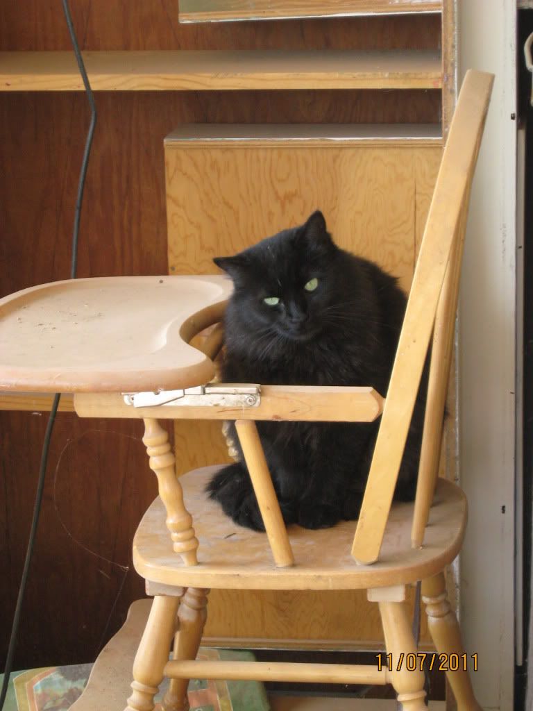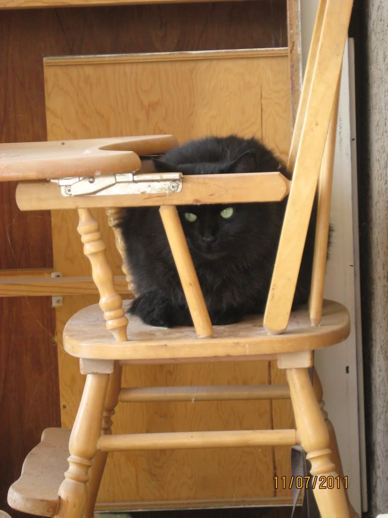 Frankie Cat on the old high chair we have stashed on the back porch.