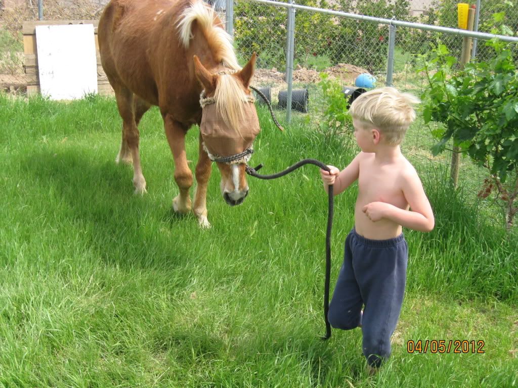 Junior is turning out to be a very well behaved, calm, food oriented horse. He greets me at the gate every morning ready to be led out to graze. He has let me lead the kids on him bareback. And as can be seen in the following photo, he'll even let the six year old move him around, however much he'd rather have his nose deep in that grass.