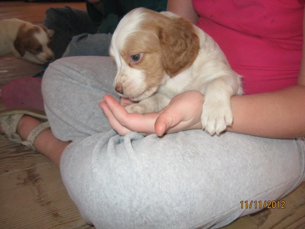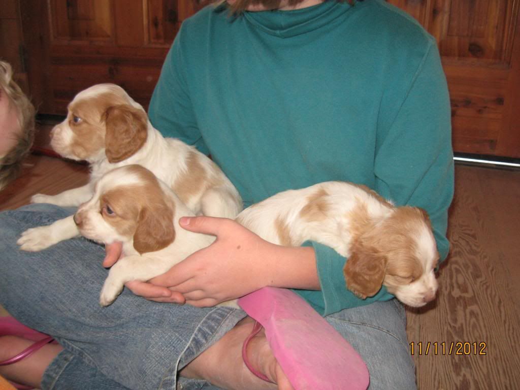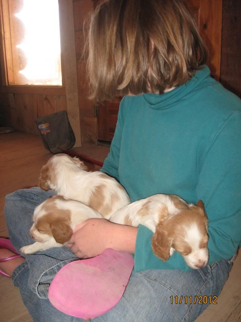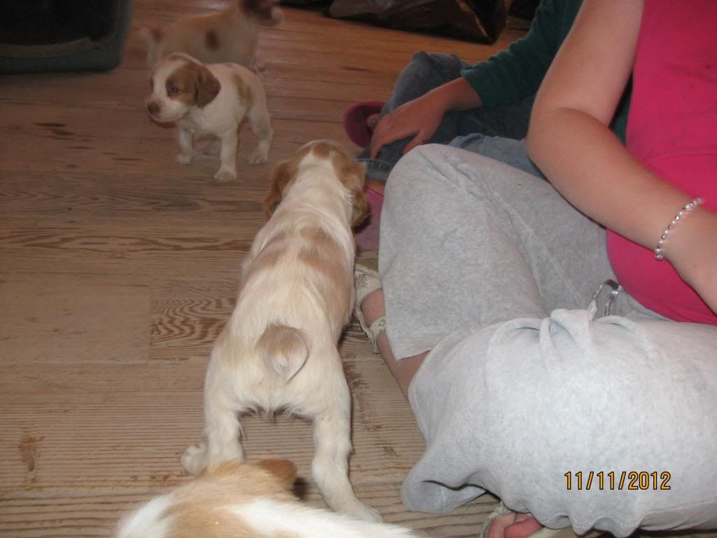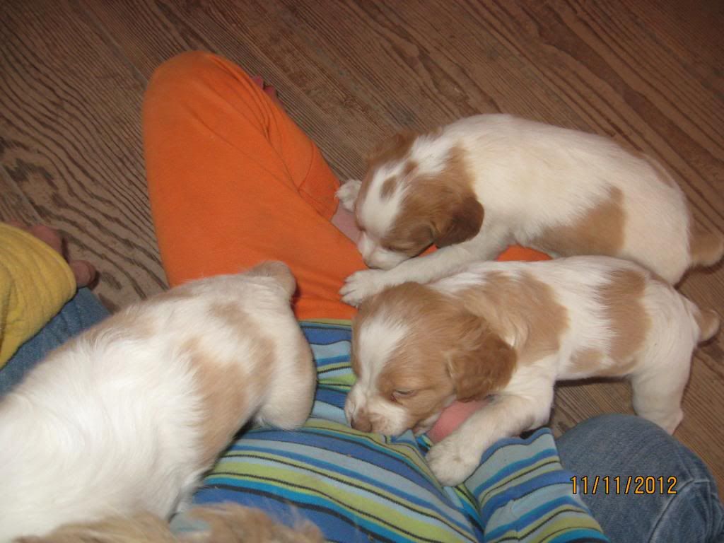 We stopped by to visit with the pups yesterday. They were very active. Major transformation from 4 weeks old. The pups ran around, climbed on us, ran around some more. After 20 minutes or so, they finally ran out of steam and fell asleep on people.