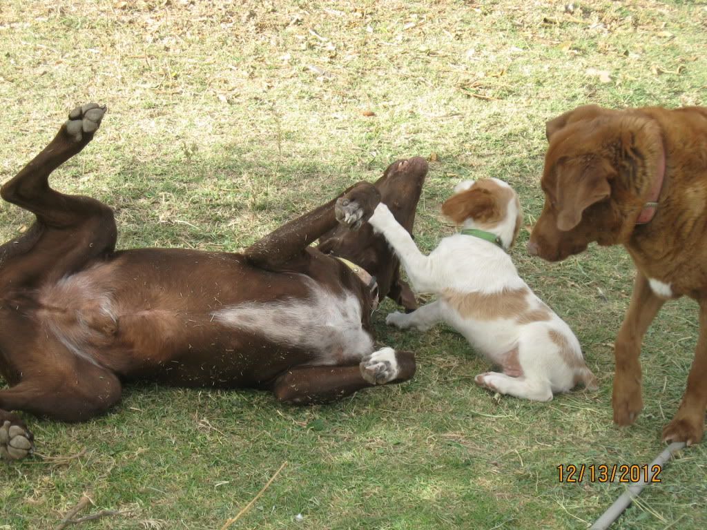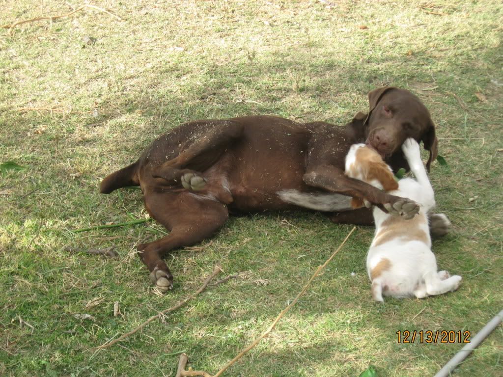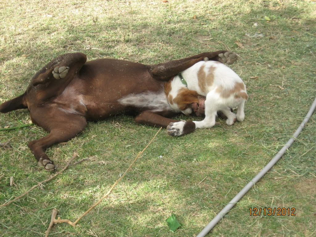 The 90 pound German Shorthaired Pointer finally figured out how to play with the nine and a half week old puppy.