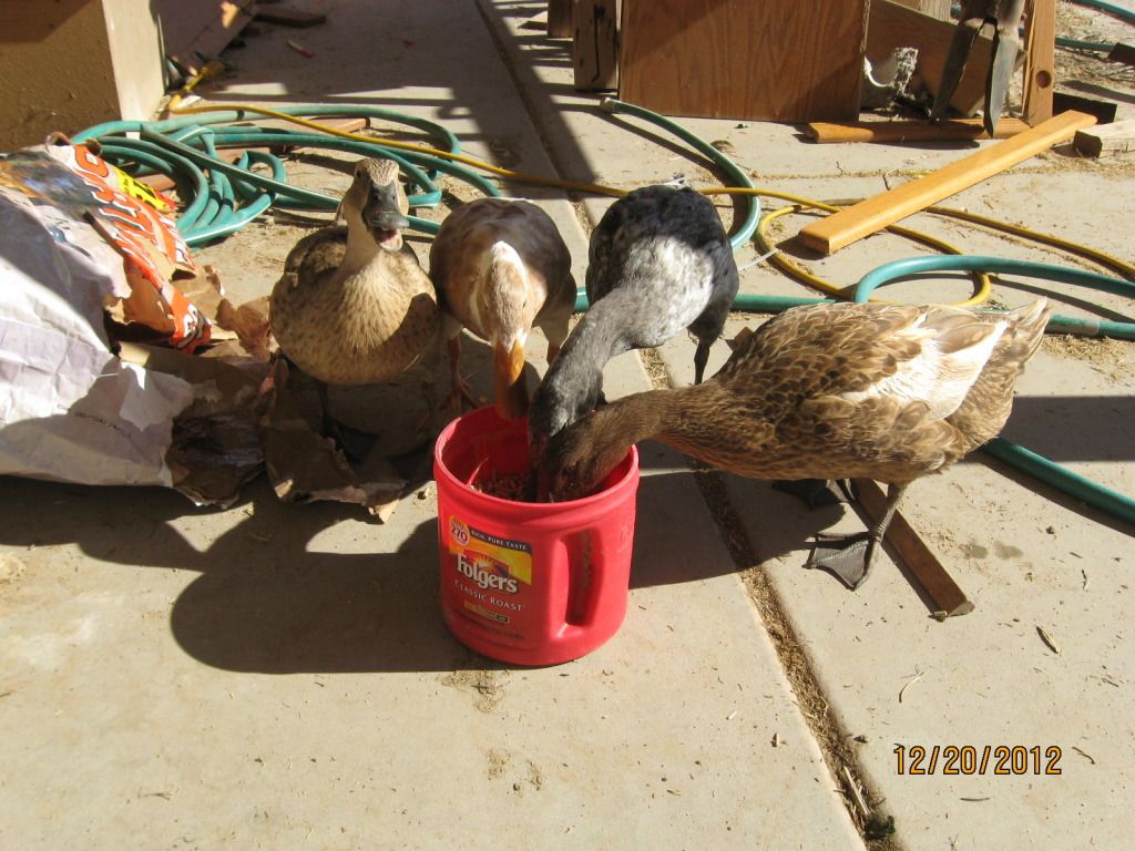 This is our new way to feed the ducks in the main yard. We used to have a house for them with a narrow enough opening that none of the dogs could get in and steal their food. Since the addition of the puppy, we gave the house to Flu-Flu, and just feed the ducks out of a bucket when they let us know they are hungry (usually when they come onto the porch and complain to us through the glass back door).