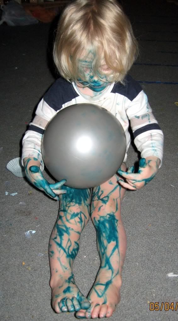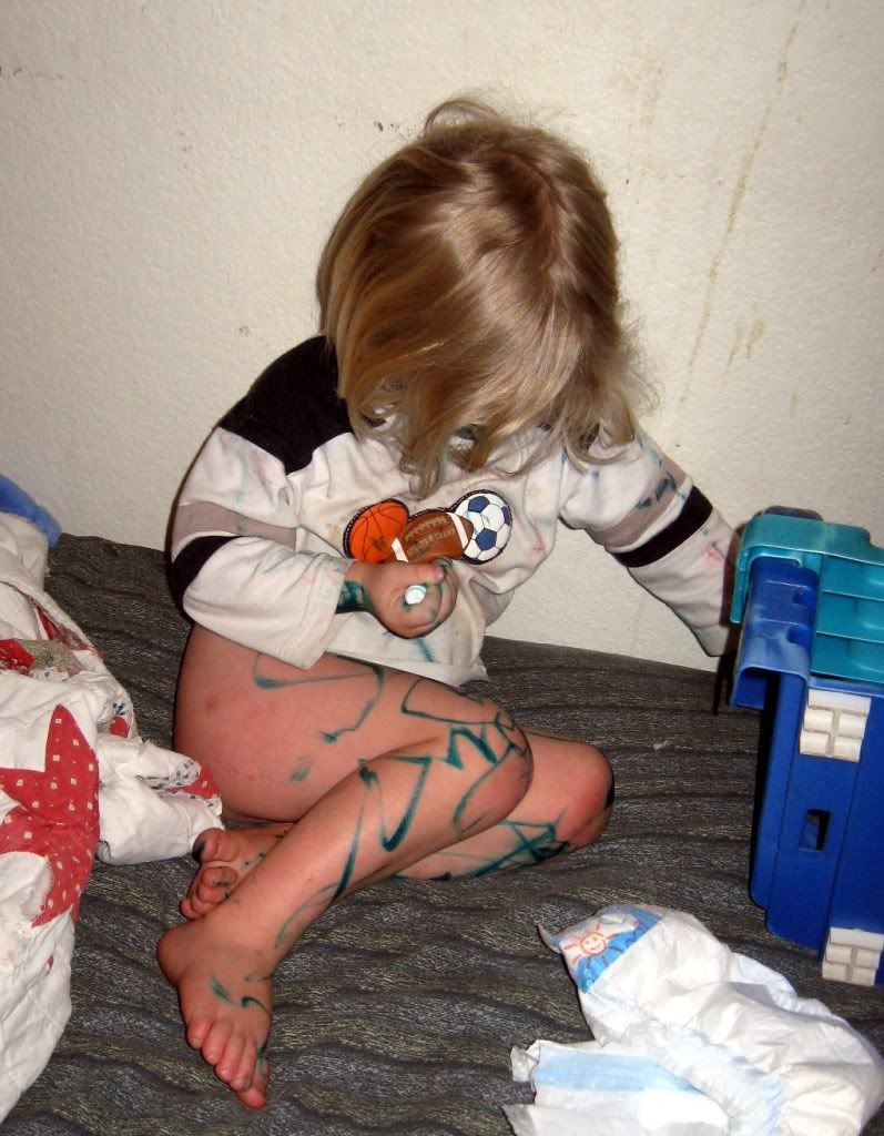 Unfortunately he chose one of our non washable markers. It did mostly wash off the next day when he wanted to be his regular self again. He's just very lightly green in spots.