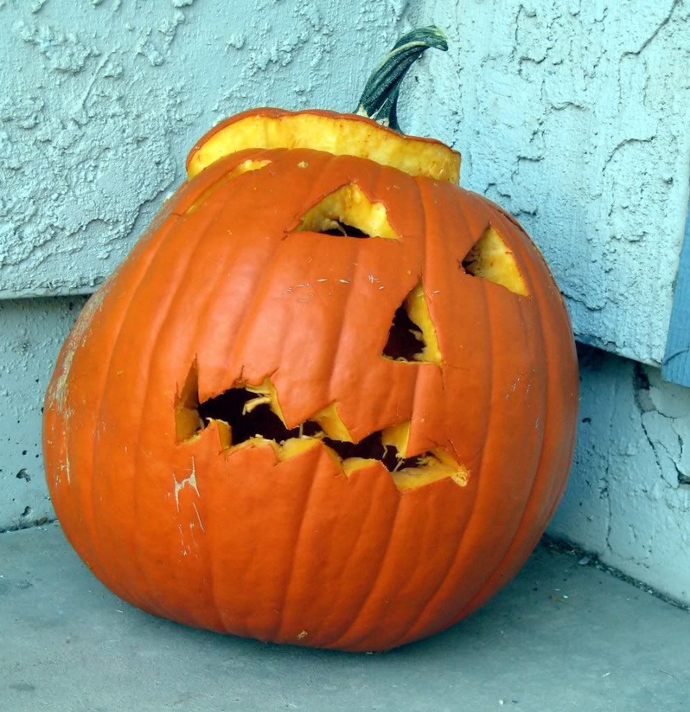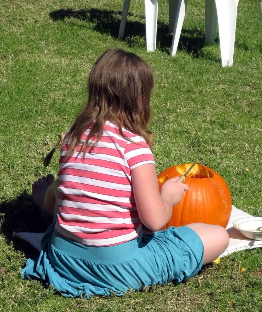 The following are pictures of our real jack-o-lanterns (and H). H carved her own pumpkin again this year, and she did all the cutting herself, even cutting off the head. I helped scoop out the guts, but just a little bit.